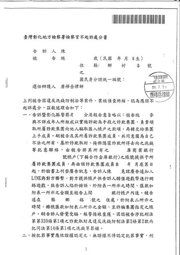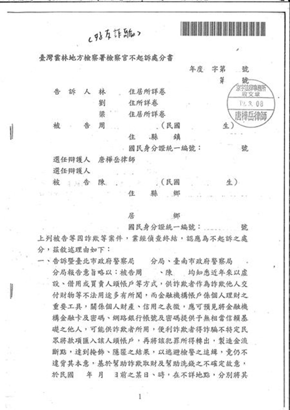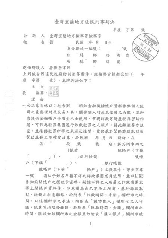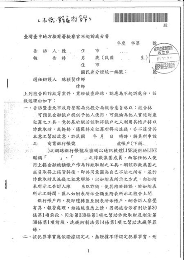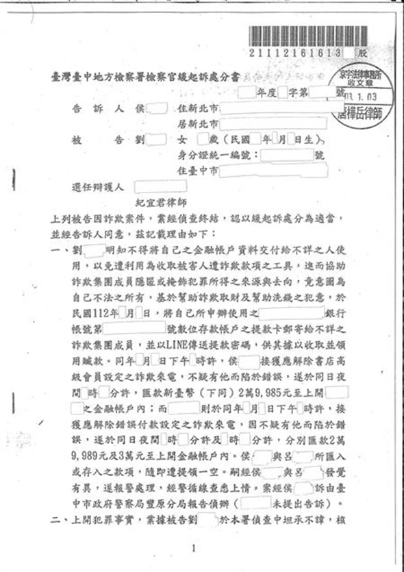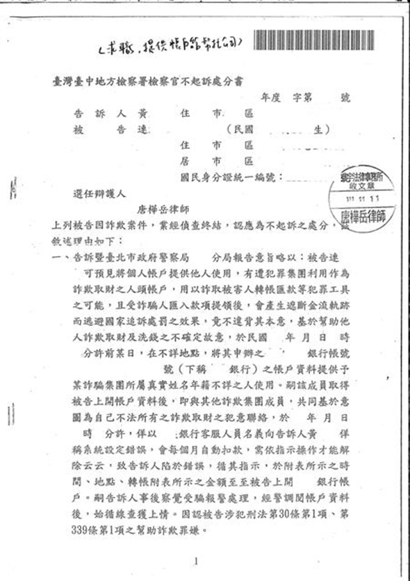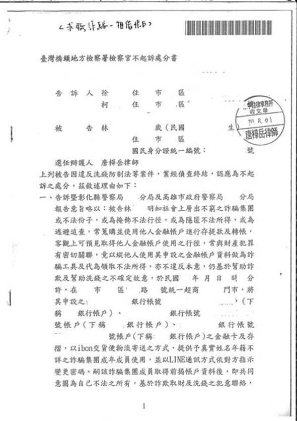 案件類型: 不拘 法律 會計 地政 次分類: 不拘 報稅 刑事案件 民事案件 家事案件 其他案件 不拘 洗錢防制法 妨害名譽 過失致死 偽造文書 妨害風化 警示帳戶 車手 妨害性自主 竊盜、恐嚇、搶奪 過失傷害 侵占案件 性騷擾防治法 毒品危害防制法 偽證罪 貪汙治罪條例 詐欺(被告) 肇事逃逸 妨害秘密 妨害農工商 賭博罪 妨害性隱私 殺人罪 刑事案件 誤信詐騙集團話術,協助多筆轉帳 成功爭取不起訴 當事人接到詐騙集團佯裝銀行高階主管電話,稱當事人誤成為某網站之高級會員,每年都會從當事人的帳戶扣繳年費,但只要依照其指示提供帳戶內所有款項提出即可解除。沒想到依照詐騙集團的指示後,事後才驚覺自己受騙且帳戶以遭警示,幸好找到「法律停看聽」的 陳律師,透過陳律師的專業答辯,成功說服檢察官替當事人爭取到不起訴。 刑事案件 求職租借帳戶遭控洗錢 成功爭取不起訴 當事人在臉書社團上找工作,貼文上留有詐騙集團的line好友訊息,待當事人加入後,對方向當事人稱公司需要提供帳戶給玩家匯款,若出借1個帳戶每個月可領3萬塊錢,當事人不疑有他將帳戶、網銀密碼提供出去,事後帳戶變成警示戶才驚覺自己是被詐騙集團利用。幸好找到「法律停看聽」的唐律師,在律師的協助下向檢察官說明當事人是在一定信任基礎且雙方有簽約的情況下,才會同意將名下帳戶提供出去,最終成功說服檢察官給予不起訴。 刑事案件 大學生網戀,慘遭詐騙集團利用成人頭戶 成功爭取無罪 當事人隻身在外地打工求學,某日在交友軟體上認識一網友,與網友平日都以親暱的稱呼相稱且對話多為曖昧內容,對方甚至拿出自己的身分證來取得當事人的信任,致當事人陷入錯誤交付自己的網銀帳號密碼給對方,事後發現自己的帳戶淪為詐騙集團利用成為人頭帳戶,幸好找到「法律停看聽」的紀律師,紀律師向法官證明當事人因社會經驗不足,才會身陷在愛情詐騙的泥淖中,成功替當事人爭取到無罪。 刑事案件 誤信詐騙手法交付三個金融帳戶,涉嫌無故交付帳戶罪 成功爭取無罪 年僅20歲的當事人在網路上參加免費占卜活動,為當事人提供感情占卜結果,嗣後再以感恩粉絲熱情參與占卜為由舉辦抽獎活動,並向當事人佯稱當事人中得10萬元頭獎,要求當事人提供匯款帳戶及密碼,以便將獎金匯入,沉浸在喜悅當中的當事人卻在幾日後收到傳票被告違反洗錢防制法,才知道占卜平台竟是詐騙集團佯裝,幸好找到「法律停看聽」的唐律師,透過唐律師的專業答辯,成功替當事人爭取到無罪。 刑事案件 違反毒品危害防治條例 成功爭取無罪 當事人受友人A所託開車載A去友人B家,卻沒想到本趟行程竟是為了交易毒品,讓當事人捲入了販賣毒品案件中,被檢察官起訴,指控他與朋友共同犯案。幸好當事人尋求到「法律停看聽」的唐律師協助,在律師仔細分析案件下,發現證人的證詞有前後矛盾之處。最終,憑藉著專業的法律知識及策略,唐律師成功為當事人爭取到無罪判決,脫離了這場不必要的法律困境。 刑事案件 家庭代工遭提告詐欺 成功爭取不起訴 當事人為改善家裡經濟,在臉書上找到家庭代工的兼職工作,後續對方稱需要當事人提供帳戶來預定及購買材料及避稅且會將節稅金回饋給當事人下,當事人信任詐騙集團的話術,認為是工作需要便將提款卡寄給對方。未料幾天後帳戶竟遭警示,才將驚覺自己遭詐騙集團利用,幸好找到「法律停看聽」的唐律師,透過律師向檢察官證明當事人因社會經驗不足,陷入錯誤遭詐騙集團所騙,成功替當事人爭取到不起訴。 刑事案件 業務侵占 成功爭取無罪 二位當事人分別擔任社區管委會的主任委員及財務委員,未料事後竟被其他住戶以帳務不清為由提告業務侵占,幸好當事人找到「法律停看聽」的游律師,律師在逐一釐清所有財報金流後,成功向法官證明當事人並無侵占管理費,成功替當事人爭取無罪。 刑事案件 詐欺案件 同意給予緩起訴 當事人一時失慮將帳戶交付給不詳之人使用,被詐騙集團利用成為人頭帳戶,意識到自己犯下錯誤後找到「法律停看聽」的紀律師,透過紀律師的專業答辯及與受害者積極協調,讓當事人與受害者順利達成和解,成功替當事人爭取到緩起訴。 刑事案件 涉嫌虛擬貨幣洗錢案 成功爭取不起訴 當事人在網路上看到詐騙集團佯裝公司的求職貼文,在加入對方好友後,對方稱要提供帳戶讓幣托公司使用,並幫忙完成入金提領工作後會給付佣金當作薪水,當事人便將存摺封面及身份證以拍照方式提供給對方使用。未料幾日後帳戶竟遭警示,當事人才驚覺自己遭詐騙集團利用。手足無措之下當事人找到「法律停看聽」的唐律師,透過律師向檢察官證明當事人是急於尋找工作,心急之下的判斷易受到影響而陷入錯誤,成功替當事人爭取到不起訴。 刑事案件 處理配偶後事,竟遭其他繼承人認為侵佔遺產 成功爭取不起訴 當事人的配偶過世,過世前有將自己的提款卡交給當事人,過世後當事人將帳戶裡的款項拿來替配偶辦後事及遺產稅等等相關規費,竟遭配偶的弟弟提告侵占,幸好當事人找到「法律停看聽」的游律師,游律師成功向檢察官證明當事人並無侵占遺產意圖,替當事人爭取到不起訴。 刑事案件 學生打工賺生活費,竟遭被告詐欺 成功爭取不起訴 出社會不久的當事人在臉書上找家庭代工,對方稱因為要購買材料卡需要當事人的金融