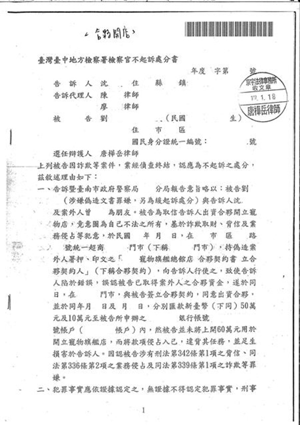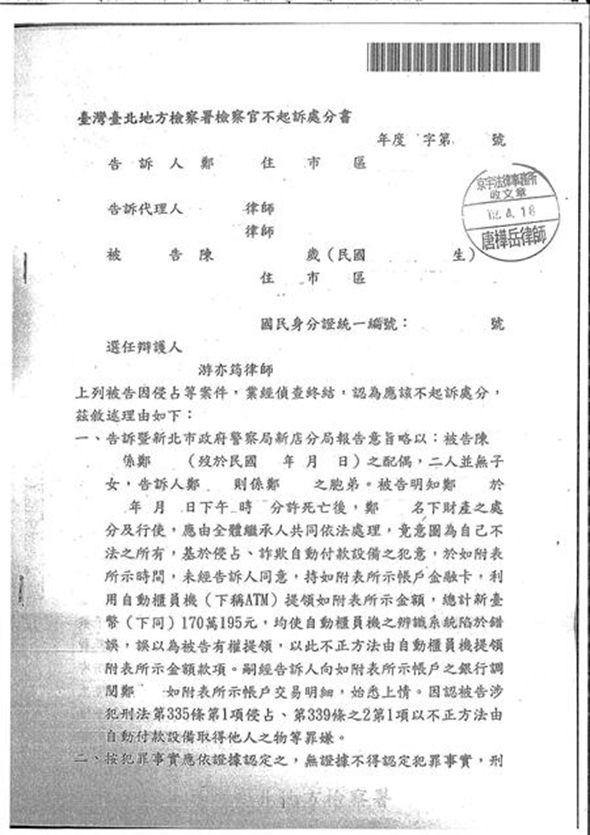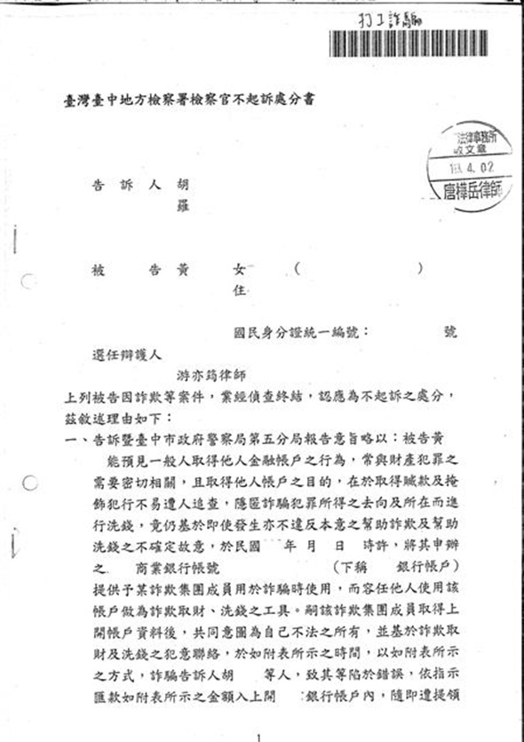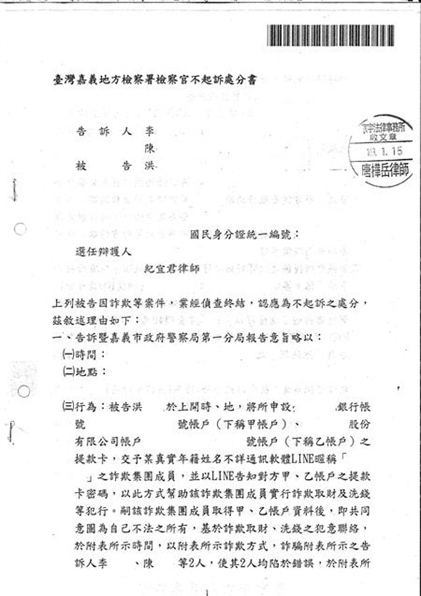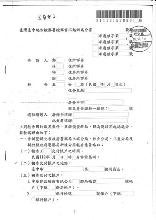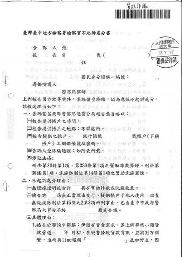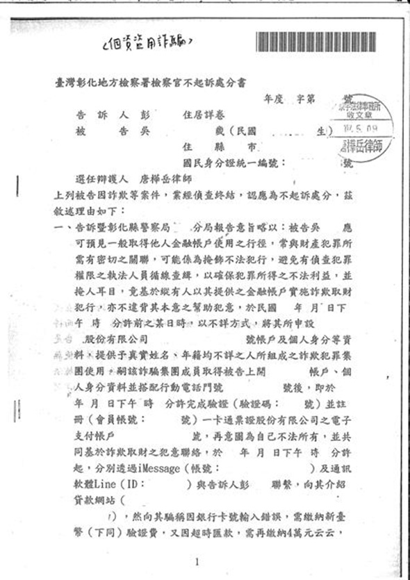 案件類型: 不拘 法律 會計 地政 次分類: 不拘 報稅 刑事案件 民事案件 家事案件 其他案件 不拘 洗錢防制法 妨害名譽 過失致死 偽造文書 妨害風化 警示帳戶 車手 妨害性自主 竊盜、恐嚇、搶奪 過失傷害 侵占案件 性騷擾防治法 毒品危害防制法 偽證罪 貪汙治罪條例 詐欺(被告) 肇事逃逸 妨害秘密 妨害農工商 賭博罪 妨害性隱私 殺人罪 刑事案件 誤信詐騙集團話術,協助多筆轉帳 成功爭取不起訴 當事人接到詐騙集團佯裝銀行高階主管電話,稱當事人誤成為某網站之高級會員,每年都會從當事人的帳戶扣繳年費,但只要依照其指示提供帳戶內所有款項提出即可解除。沒想到依照詐騙集團的指示後,事後才驚覺自己受騙且帳戶以遭警示,幸好找到「法律停看聽」的 陳律師,透過陳律師的專業答辯,成功說服檢察官替當事人爭取到不起訴。 刑事案件 求職租借帳戶遭控洗錢 成功爭取不起訴 當事人在臉書社團上找工作,貼文上留有詐騙集團的line好友訊息,待當事人加入後,對方向當事人稱公司需要提供帳戶給玩家匯款,若出借1個帳戶每個月可領3萬塊錢,當事人不疑有他將帳戶、網銀密碼提供出去,事後帳戶變成警示戶才驚覺自己是被詐騙集團利用。幸好找到「法律停看聽」的唐律師,在律師的協助下向檢察官說明當事人是在一定信任基礎且雙方有簽約的情況下,才會同意將名下帳戶提供出去,最終成功說服檢察官給予不起訴。 刑事案件 大學生網戀,慘遭詐騙集團利用成人頭戶 成功爭取無罪 當事人隻身在外地打工求學,某日在交友軟體上認識一網友,與網友平日都以親暱的稱呼相稱且對話多為曖昧內容,對方甚至拿出自己的身分證來取得當事人的信任,致當事人陷入錯誤交付自己的網銀帳號密碼給對方,事後發現自己的帳戶淪為詐騙集團利用成為人頭帳戶,幸好找到「法律停看聽」的紀律師,紀律師向法官證明當事人因社會經驗不足,才會身陷在愛情詐騙的泥淖中,成功替當事人爭取到無罪。 刑事案件 誤信詐騙手法交付三個金融帳戶,涉嫌無故交付帳戶罪 成功爭取無罪 年僅20歲的當事人在網路上參加免費占卜活動,為當事人提供感情占卜結果,嗣後再以感恩粉絲熱情參與占卜為由舉辦抽獎活動,並向當事人佯稱當事人中得10萬元頭獎,要求當事人提供匯款帳戶及密碼,以便將獎金匯入,沉浸在喜悅當中的當事人卻在幾日後收到傳票被告違反洗錢防制法,才知道占卜平台竟是詐騙集團佯裝,幸好找到「法律停看聽」的唐律師,透過唐律師的專業答辯,成功替當事人爭取到無罪。 刑事案件 違反毒品危害防治條例 成功爭取無罪 當事人受友人A所託開車載A去友人B家,卻沒想到本趟行程竟是為了交易毒品,讓當事人捲入了販賣毒品案件中,被檢察官起訴,指控他與朋友共同犯案。幸好當事人尋求到「法律停看聽」的唐律師協助,在律師仔細分析案件下,發現證人的證詞有前後矛盾之處。最終,憑藉著專業的法律知識及策略,唐律師成功為當事人爭取到無罪判決,脫離了這場不必要的法律困境。 刑事案件 家庭代工遭提告詐欺 成功爭取不起訴 當事人為改善家裡經濟,在臉書上找到家庭代工的兼職工作,後續對方稱需要當事人提供帳戶來預定及購買材料及避稅且會將節稅金回饋給當事人下,當事人信任詐騙集團的話術,認為是工作需要便將提款卡寄給對方。未料幾天後帳戶竟遭警示,才將驚覺自己遭詐騙集團利用,幸好找到「法律停看聽」的唐律師,透過律師向檢察官證明當事人因社會經驗不足,陷入錯誤遭詐騙集團所騙,成功替當事人爭取到不起訴。 刑事案件 業務侵占 成功爭取無罪 二位當事人分別擔任社區管委會的主任委員及財務委員,未料事後竟被其他住戶以帳務不清為由提告業務侵占,幸好當事人找到「法律停看聽」的游律師,律師在逐一釐清所有財報金流後,成功向法官證明當事人並無侵占管理費,成功替當事人爭取無罪。 刑事案件 詐欺案件 同意給予緩起訴 當事人一時失慮將帳戶交付給不詳之人使用,被詐騙集團利用成為人頭帳戶,意識到自己犯下錯誤後找到「法律停看聽」的紀律師,透過紀律師的專業答辯及與受害者積極協調,讓當事人與受害者順利達成和解,成功替當事人爭取到緩起訴。 刑事案件 涉嫌虛擬貨幣洗錢案 成功爭取不起訴 當事人在網路上看到詐騙集團佯裝公司的求職貼文,在加入對方好友後,對方稱要提供帳戶讓幣托公司使用,並幫忙完成入金提領工作後會給付佣金當作薪水,當事人便將存摺封面及身份證以拍照方式提供給對方使用。未料幾日後帳戶竟遭警示,當事人才驚覺自己遭詐騙集團利用。手足無措之下當事人找到「法律停看聽」的唐律師,透過律師向檢察官證明當事人是急於尋找工作,心急之下的判斷易受到影響而陷入錯誤,成功替當事人爭取到不起訴。 刑事案件 處理配偶後事,竟遭其他繼承人認為侵佔遺產 成功爭取不起訴 當事人的配偶過世,過世前有將自己的提款卡交給當事人,過世後當事人將帳戶裡的款項拿來替配偶辦後事及遺產稅等等相關規費,竟遭配偶的弟弟提告侵占,幸好當事人找到「法律停看聽」的游律師,游律師成功向檢察官證明當事人並無侵占遺產意圖,替當事人爭取到不起訴。 刑事案件 學生打工賺生活費,竟遭被告詐欺 成功爭取不起訴 出社會不久的當事人在臉書上找家庭代工,對方稱因為要購買材料卡需要當事人的金融